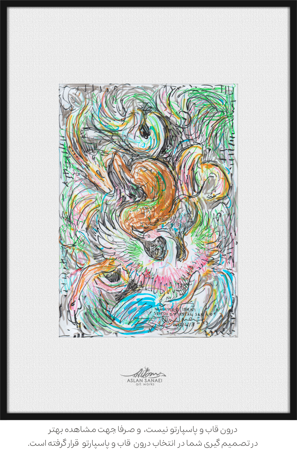 بهطور کلی میتوان گفت این کار تلفیقی از مینیاتور ایرانی و اکسپرسیونیسم مدرن است؛ جایی که روح روایت و نمادهای کهن در کنار آزادی تکنیکی و بیانی معاصر قرار میگیرند تا تصویری میان افسانه و انرژی لحظه خلق شود.