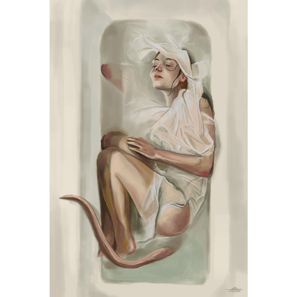 عنصر غیرمنتظره، دم حیوانی (شبیه دم موش یا گربه) است که از بدن بیرون زده و فضای اثر را به سمت نمادگرایی و روایت استعاری میبرد؛ انگار شخصیت انسانی با جنبهای حیوانی یا پنهان درونی خویش درگیر است.