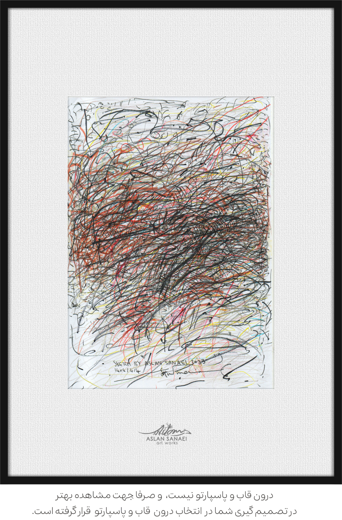 - راپید (خودکار یا قلم نوکفلزی مشکی): برای ایجاد خطوط ظریف، پیوسته و کنترلشده که اسکلت اصلی اثر و حرکتهای سریع را تشکیل میدهند. راپید به دلیل یکنواختی جوهر، برای خطوط ممتد و پرانرژی مناسب است و در اینجا نقش اصلی را در ساختار و آشوب بصری ایفا کرده است.