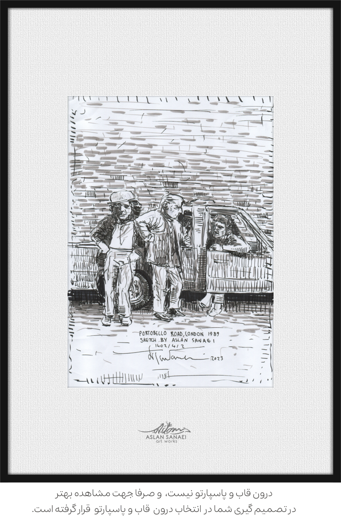 این اسکچ سیاه‌قلم با الهام از خیابان Portobello Road، لندن، سال ۱۹۸۹، صحنه‌ای زنده و پرجزئیات از لحظه‌ای روزمره را ثبت کرده است. سه نفر در کنار یک وانت پارک‌شده، بی‌تکلف و در حال گفت‌وگویی خیابانی، در برابر دیواری آجری ایستاده‌اند.خطوط سریع و سایه‌زنی‌های مورب و افقی، بافت آجری پس‌زمینه را جان‌دار کرده و حس مستندنگاری تصویری را تشدید می‌کند. انتخاب حالت طبیعی سوژه‌ها، فضایی صمیمی و واقع‌گرایانه ایجاد کرده که بیننده را مستقیماً به حال‌وهوای لندن دهه ۸۰ میلادی می‌برد.امضای Aslan Sanaei و تاریخ دقیق خلق اثر، آن را به قطعه‌ای اصیل و مستندگونه تبدیل کرده است؛ مناسب برای دوستداران هنر شهری و مجموعه‌دارانی که به ثبت لحظات ناب و گذرا در بستر تاریخ علاقه دارند.