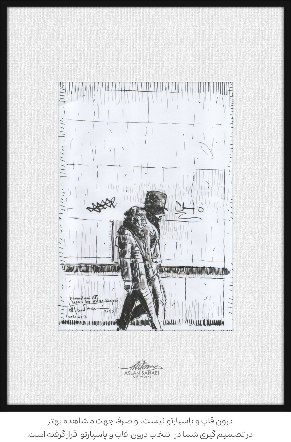 این اسکچ ساده و پرمفهوم، دو رهگذر را در حال قدم زدن در کنار دیواری شهری به تصویر می‌کشد؛ یکی با کت ضخیم و یقه خزدار، دیگری با کلاه بلند کلاسیک. خطوط عمودی و افقی پس‌زمینه، حس نظم و سکون را القا می‌کنند، در حالی که حرکت آرام سوژه‌ها، گرمی انسانی اثر را حفظ می‌کند.اثر با عنوان “Fur Muff and Hat” توسط Aslan Sanaei خلق شده است و ترکیب جزئیات پوشش با فضای مینیمال اطراف، آن را به بخشی از روایت بصری زندگی شهری تبدیل کرده است. استفاده از سایه‌زنی‌های دقیق برای بافت لباس و کلاه، حس لمس‌پذیری و عمق را به صحنه می‌بخشد.این تابلو، انتخابی ایده‌آل برای علاقه‌مندان به هنر شهری با رویکرد روایی و کسانی است که ارزش لحظات بی‌ادعا و گذرای روزمره را در قالب آثار هنری درک می‌کنند.